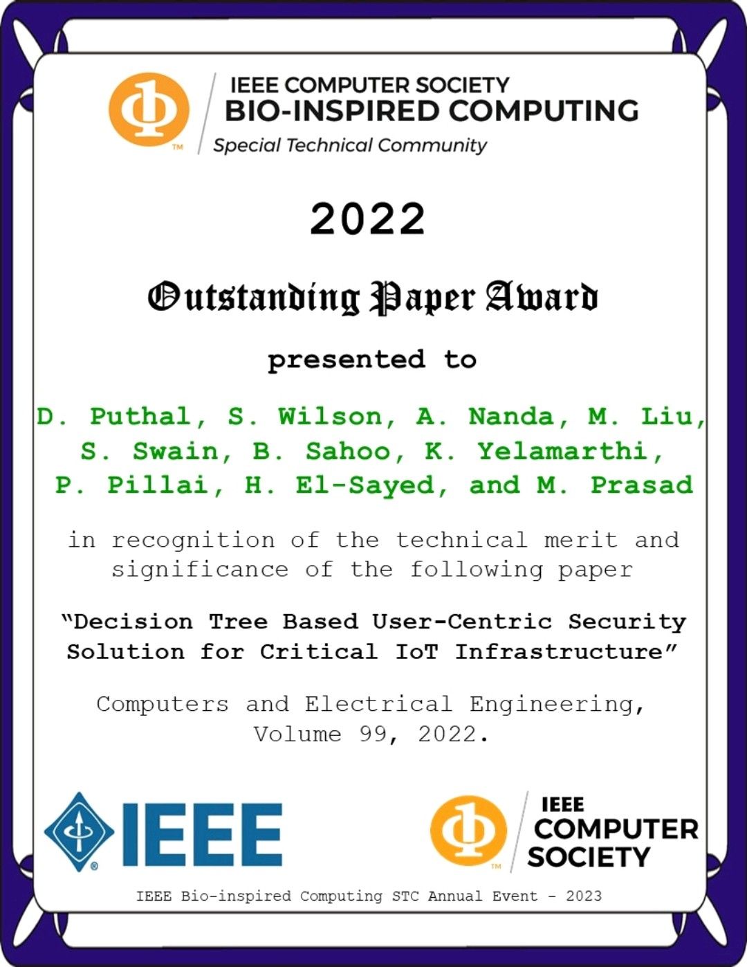 - Outstanding Paper Award IEEE Bio-inspired Computing STC (2022) for the paper "Decision tree based user-centric security solution for critical IoT infrastructure"(PDF)